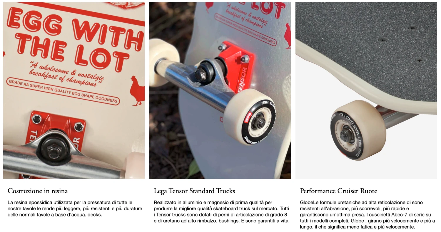 Shaped completes for having a good time whilst shredding. The Eggy in size 8,625 colorway Off-White/The Lot features deck constructed from Resin-7 hard rock maple with Mellow concave. It also has medium nose and tail kick, 5.25 Tensor alloy trucks and 55mm Conical 101a wheels with Split black griptape. Paint dipped deck.